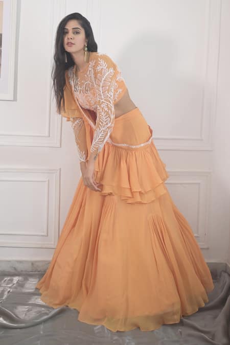 Yellow lehenga set featuring a hand embroidered blouse with glass beads, pearls, and sequins. The lehenga has a length of 45 inches and includes a ruffled drape with sheer sleeves.