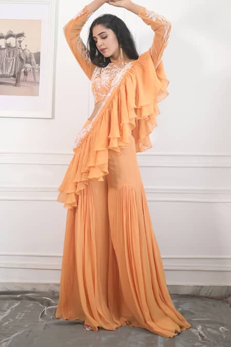 Sheer sleeves with intricate embroidery, Ruffled drape detail on sharara, Godet style for added flair