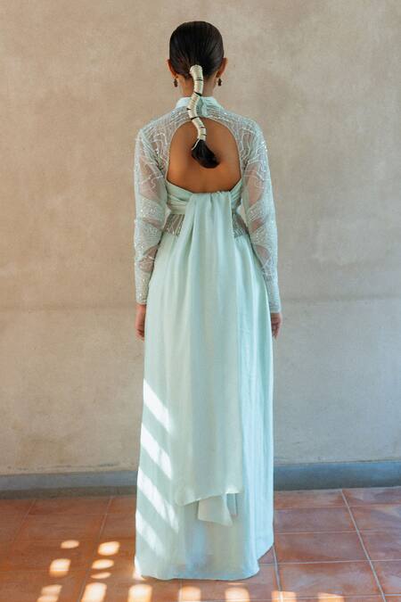Blouse features a back cut-out detail, Sheer base with intricate beadwork, Pleated skirt with a sequined waist panel