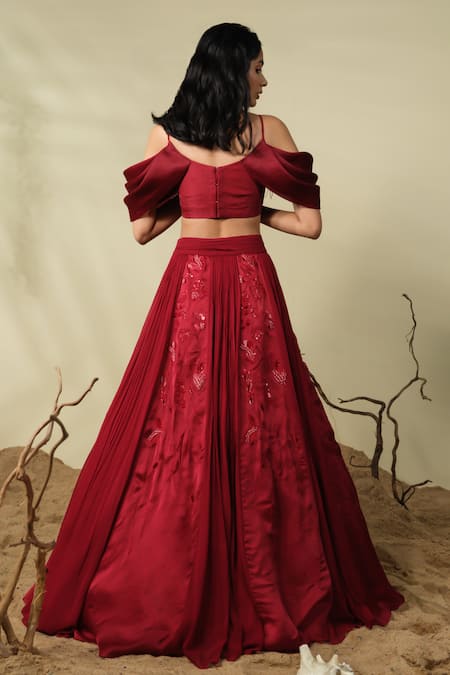 Carmine red lehenga featuring 3D embroidered floral motifs and a draped off-shoulder blouse. The ensemble includes a lehenga and a blouse crafted from Chanderi, Satin Organza, and Georgette with intricate bead, sequin, and thread work.