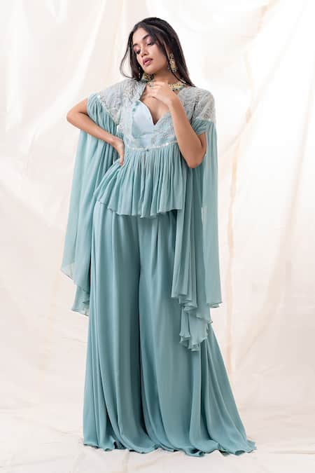 Plunge V neck with intricate embroidery, Flutter sleeves on the jacket, Front button closure for easy wear