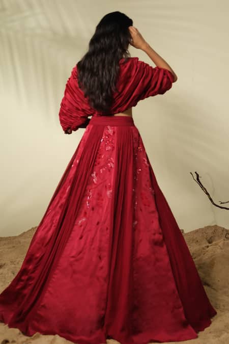 Carmine red lehenga featuring 3D beads, sequins, and thread embroidery. Accompanied by a ruched blouse with draped sleeves and a V neck.
