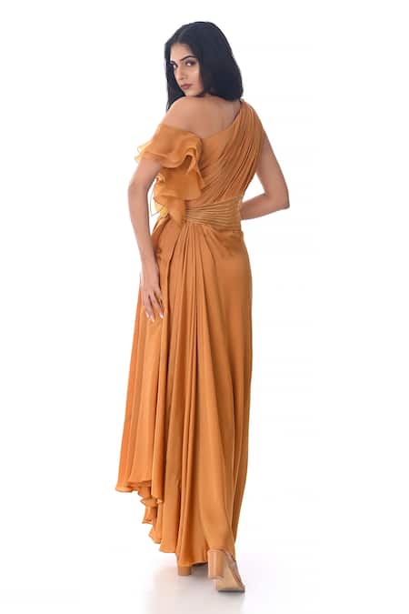 Ochre one shoulder gown featuring a sheer waistline and 3D thread hand embroidery on the sleeve