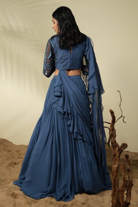 Greyish blue pre-draped lehenga saree featuring ruffled detailing. Accompanied by a blouse adorned with 3D beads, sequins, and thread embroidery with sheer sleeves.