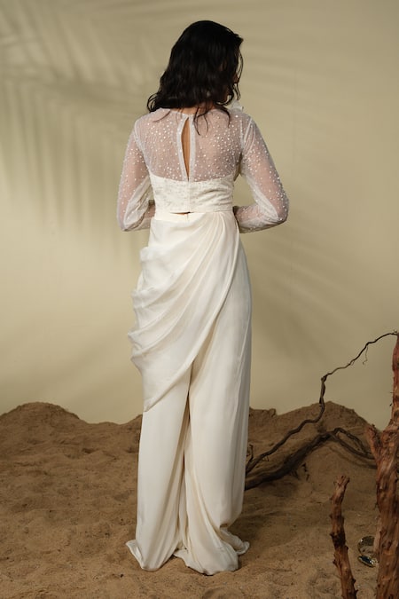 Ivory top featuring 3D bead, sequins, and thread embroidery with sheer sleeves. Paired with a pleated palazzo for a coordinated look.