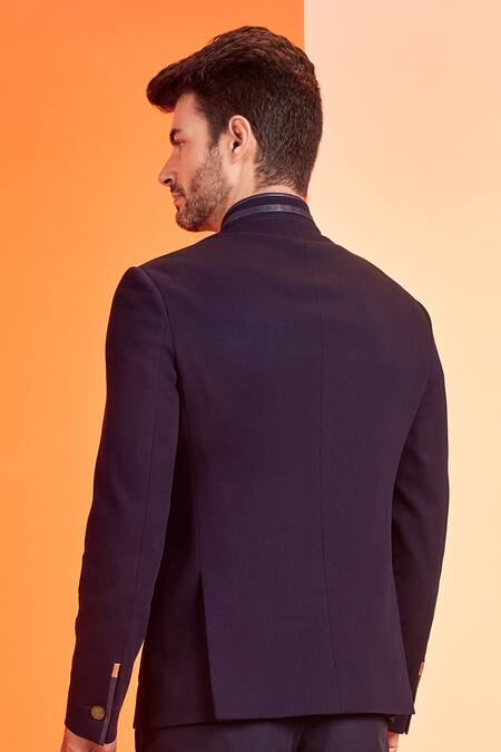 Navy bandhgala with intricately crafted signature crest, featuring a blend of Indian heritage with its structured Nehruvian collar and faux leather detailing.