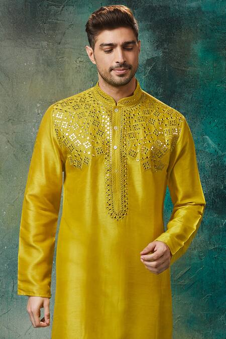 Yellow kurta with full sleeves, mandarin collar, placement thread & mirror embroidery. Paired with contrast straight pant.