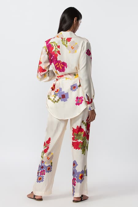 Shop_Saaksha & Kinni_Ivory Silk Placement Print Trouser _at_Aza_Fashions