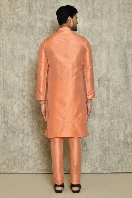 Peach cotton silk kurta with crystal lined buttons. Comes with matching solid cotton churidar.