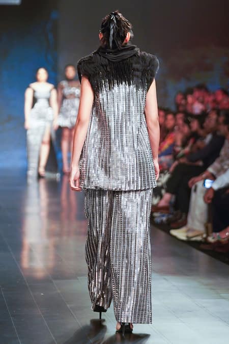 Gunmetal sleeveless blazer featuring plastic sequin embellishments and a black organza panel at the shoulder
