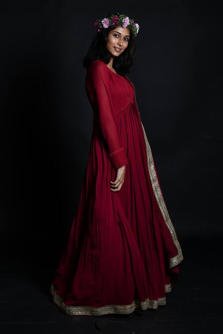 Maroon anarkali with pleated pattern & golden embroidered border. Paired with dupatta.