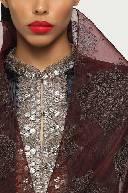 Buy_Kiran Uttam Ghosh_Grey Pleated Asymmetric Kurta_at_Aza_Fashions
