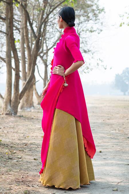 Buy_Kiran Uttam Ghosh_Pink Polyester V Neck Pleated Asymmetric Wrap Tunic _Online_at_Aza_Fashions