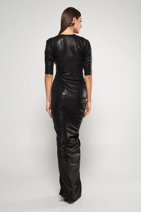 Black gown featuring a V neck, half sleeves, and pleated drape details