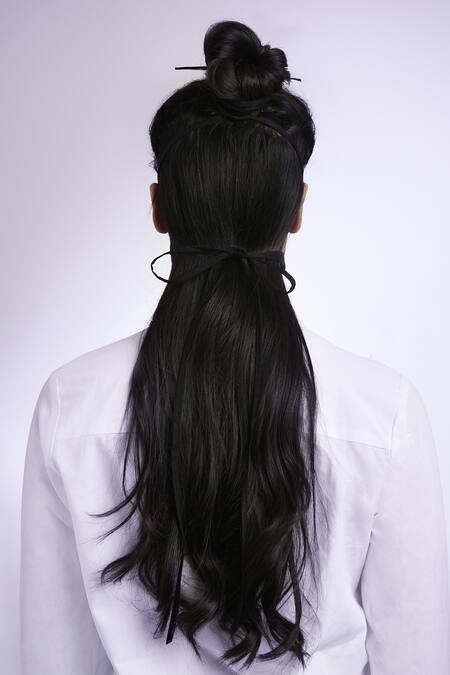Black cotton poplin mask with front pleats, side buttons, and long strings to tie at the back.