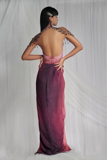 Dawn shaded pink pleated gown in habutai silk with crystals & bead placement embellished, multi-strings detail..