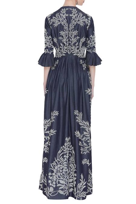 This eye-catching and striking grey maxi dress is enhanced with applique work all over.