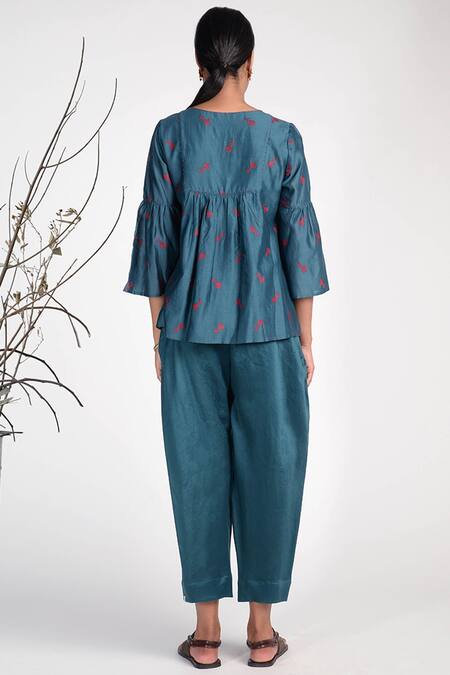 Blue Silk Cotton Blend Pleated Pants