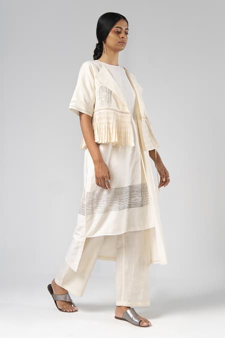 Off White Cotton Open Neck Block Print And Pleated Peplum Jacket