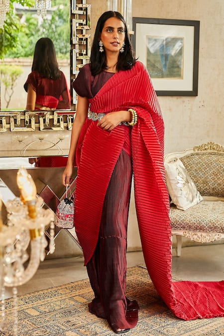 Buy_Tasuvure Indes_Red Pleated Polyester Round Saree Gown With Blouse_Online_at_Aza_Fashions