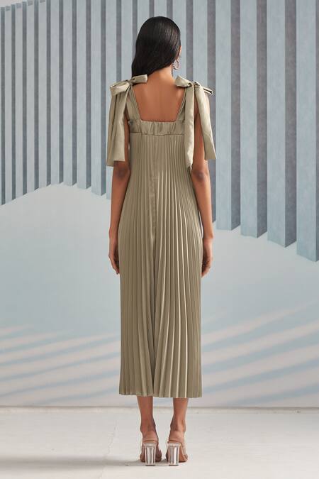 Green slip dress with pleated pattern all over & tie-up straps on shoulders.