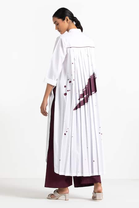 Off white shirt style tunic with back-pleated, applique stripe & splash print. Paired with wine flared pant.