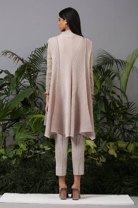 Pleats By Aruni_Beige Polyester High Pleated Tunic And Pant Set_Online_at_Aza_Fashions