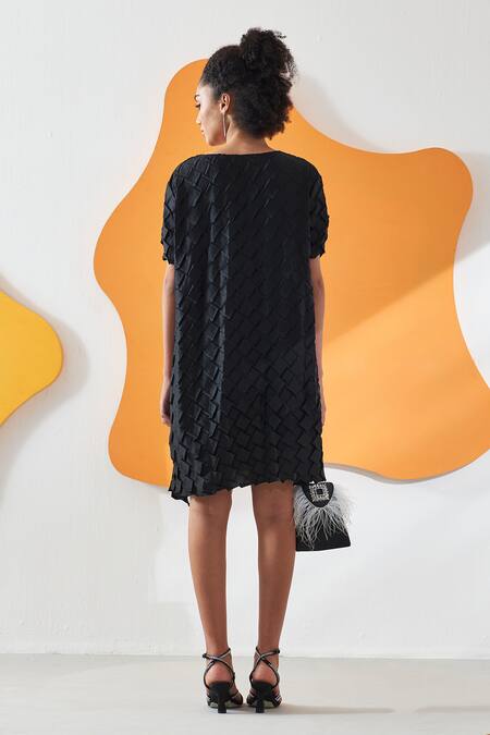 Black Crepe Satin Solid Round Anyaa Origami Folds Pleated Short Dress
