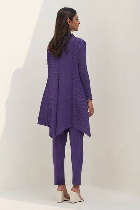 Purple high neck kurta with crushed sleeves. Paired with pleated pant.