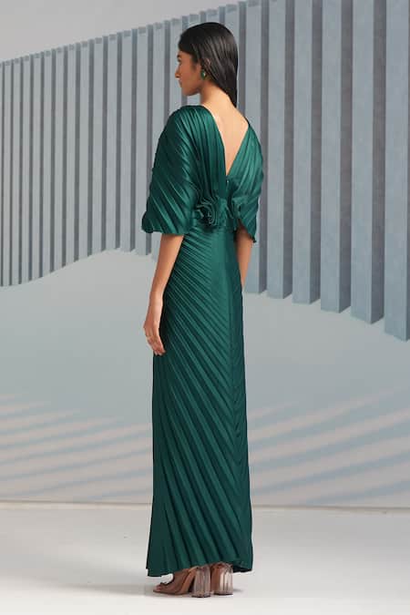 Green flared sleeve gown with pleated detailing all over & gathered at the waist.