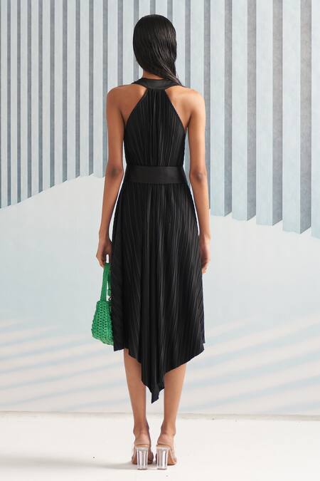 Green, black colorblock dress with hatler neckline & pleated detailing all over.