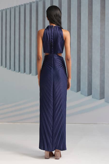 Blue halter neck gown with pleated detailing all over & waist cut-out.