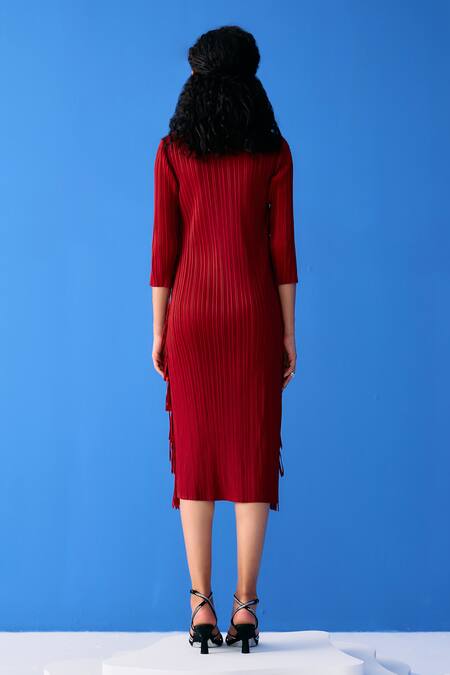 Maroon dress featuring a round neckline and three-quarter sleeves