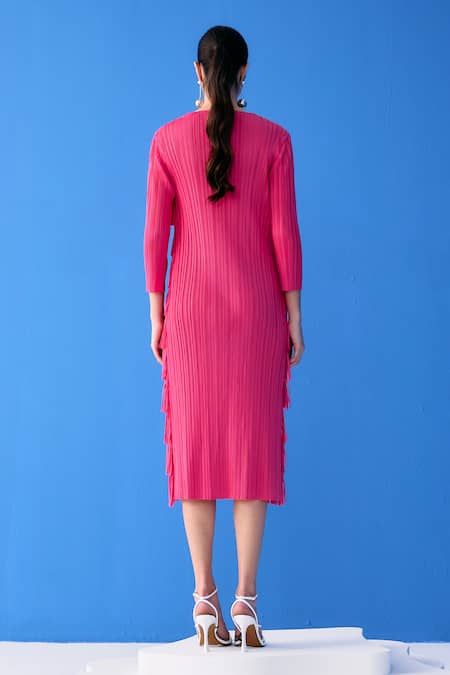 Fuchsia pink midi dress featuring a round neckline and three fourth sleeves