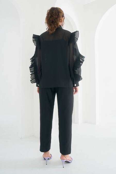 Black pant made from chanderi fabric featuring an elasticated waist at the back