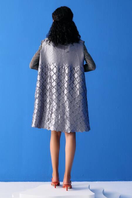 Grey dress featuring mermaid skin detailing, round neckline, and long sleeves in textured polyester