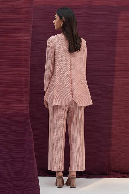 Pink Polyester V Neck Metallic Pleated Top And Pant Set