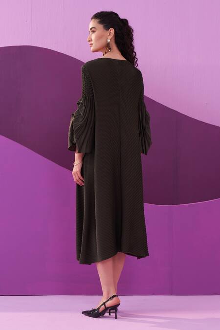 Pleated puff sleeves for added volume, Textured fabric with diagonal patterns, Asymmetrical hem for a modern silhouette
