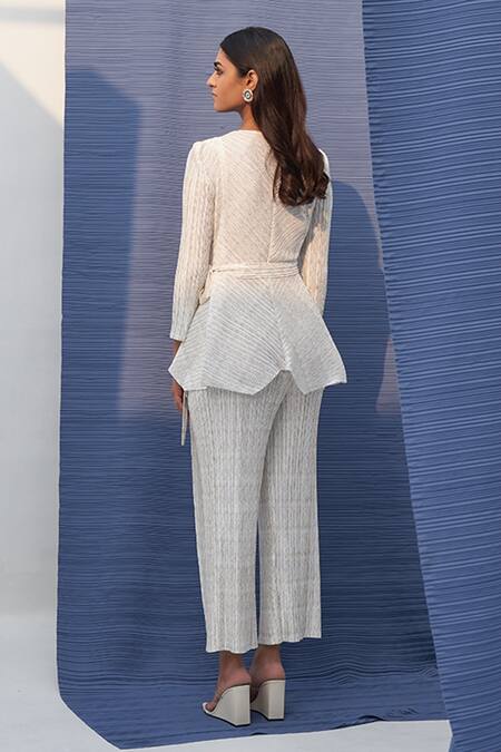 White pleated top in polyester base. Paired with matching metallic pleated culotte pant and waist belt.