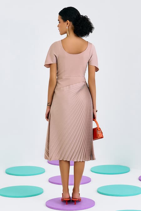 Beige Crepe Brooches Boat Neck Pleated Midi Dress