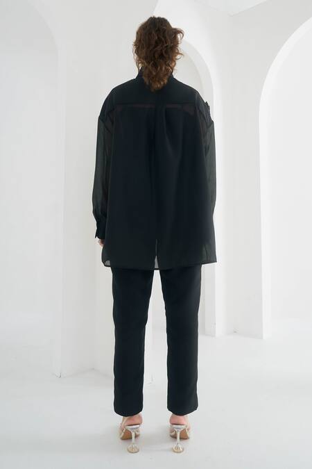 Black Organza Embroidery Collared Yasmin Chanderi 3d Floral Shirt