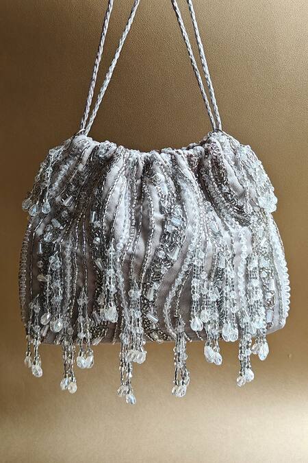 Grey potli bag featuring hand-embroidered wave patterns and crystal bead tassel embellishments