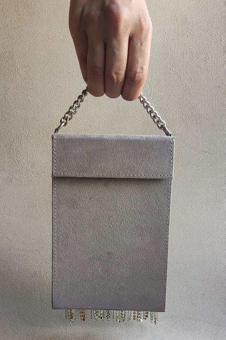 Silver handbag featuring hand embellished tassels and a magnetic flap closure