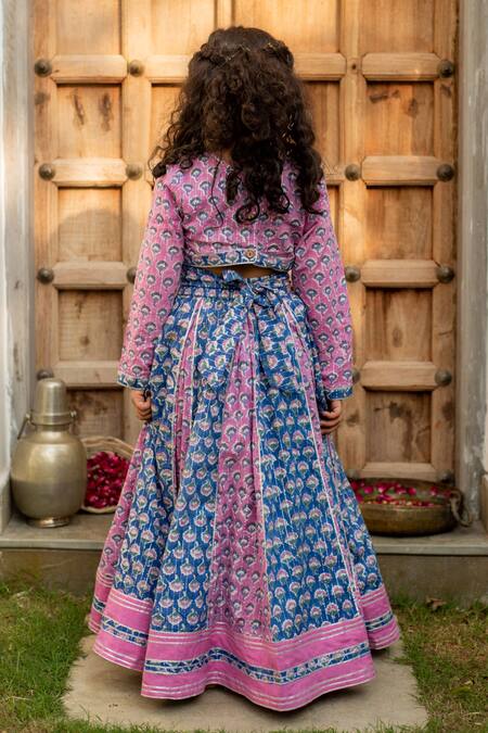 Blue and purple handloom cotton lehenga featuring a box pleated design and floral hand block print. Paired with a printed top having a contrast border and a V back.