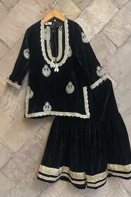 Black Velvet, Silk Embroidery, Zari, Tassels, Gota Patti Kurta Sharara Set