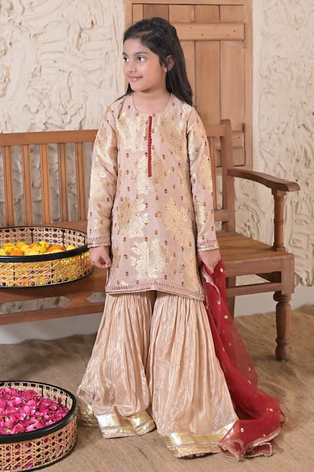 Traditional Indian ethnic wear for kids, featuring a kurta, sharara, and dupatta with floral patterns and gota lace.