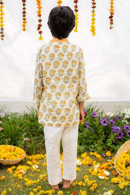 Yellow kurta featuring all-over floral butti hand block print with contrast placket and collar. Paired with straight pants for a complete look.