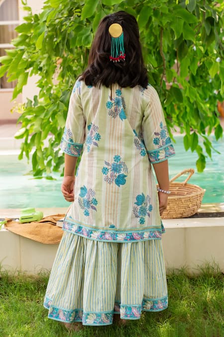 Hand block printed floral motifs, Striped pattern on kurta & sharara, Handwork detailing on top and hem