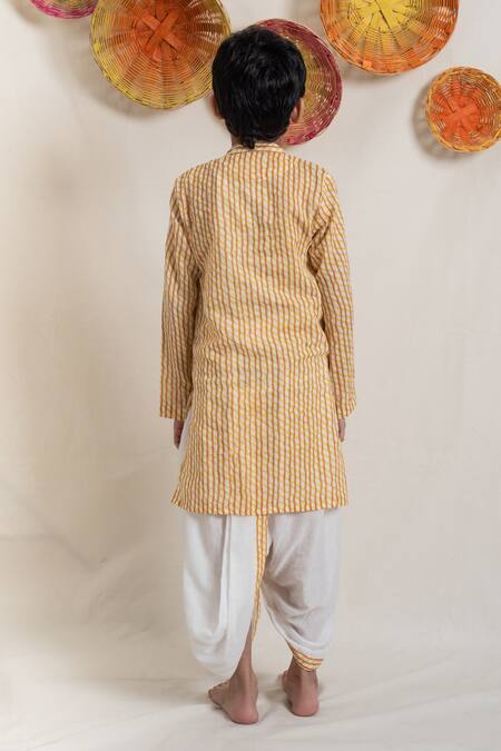 Yellow and orange kurta featuring a mandarin collar and full sleeves with stripe hand block print. Paired with a matching dhoti pant for a complete look.