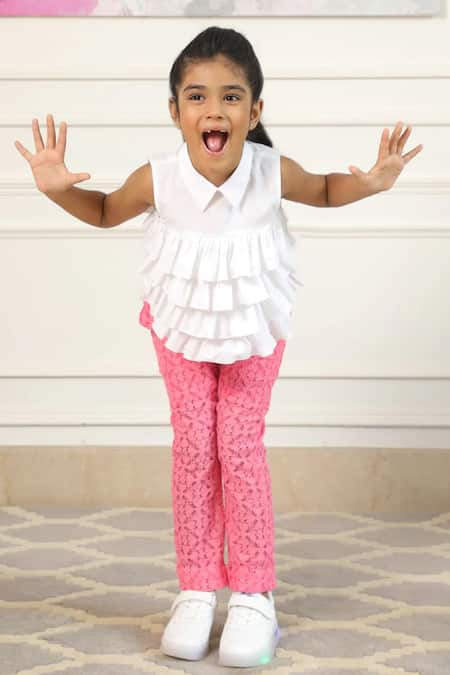 White Top Cotton Solid Lace Tiered Frill With Pant